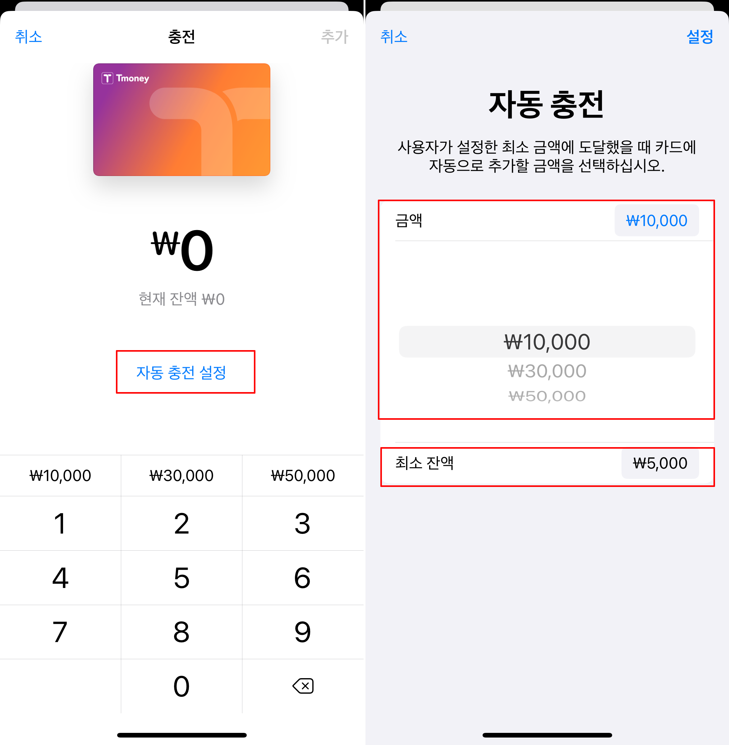 - '다음 금액 미만 시 충전' : 얼마 이하로 잔액이 남았을 때 충전할지 기준 금액을 정해요. (예: 10,000원)