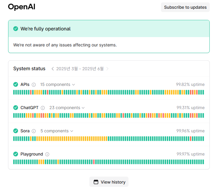 (1) OpenAI Status Page: OpenAI는 챗GPT의 서버 상태를 실시간으로 확인할 수 있는 페이지를 제공합니다. 만약 이곳에서 서비스 중단 메시지가 뜬다면, 기다리는 수밖에 없겠죠?